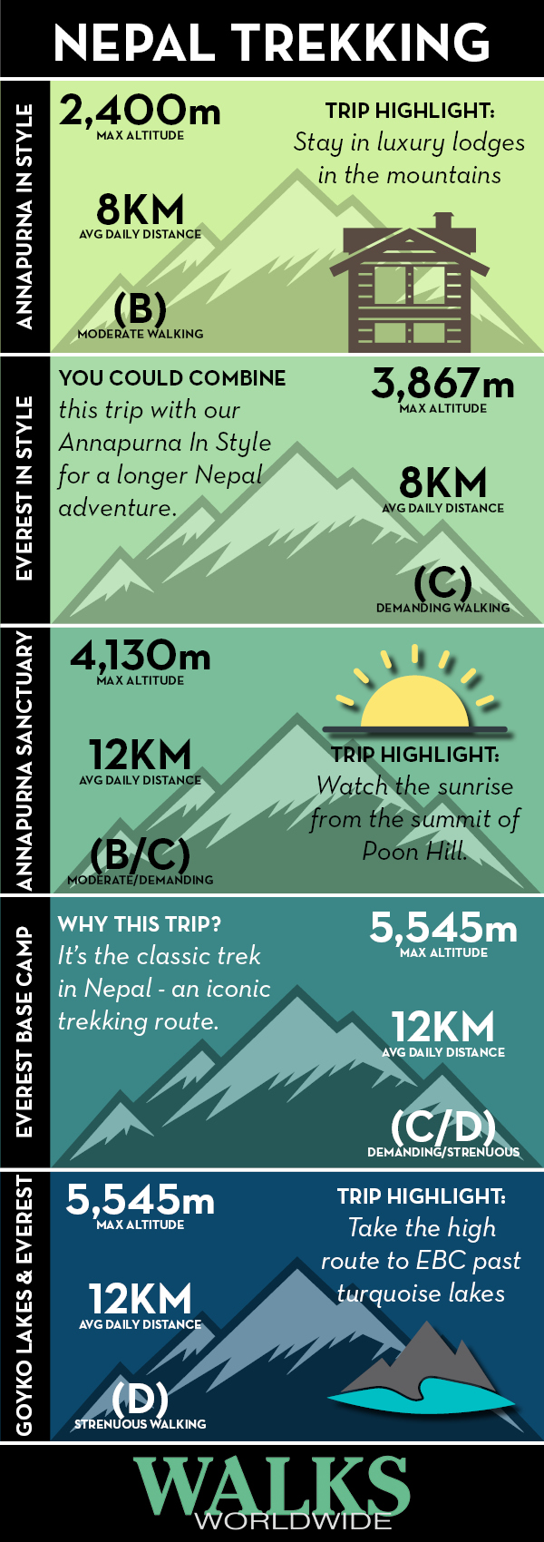 This infographic ranks our treks in Nepal, from the least demanding to the most. If you’re unsure about your ability, just give us a call – we are all experienced walkers and will give honest advice using our firsthand knowledge.