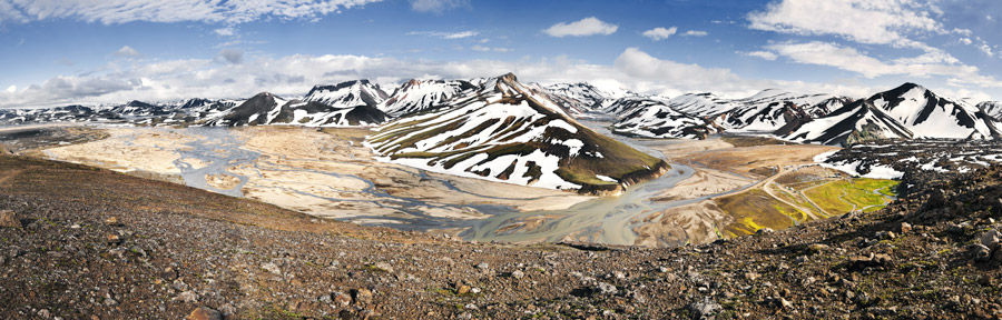 The Landmannalauger Nature Reserve in the southern part of the island is well known for its broad ranging scenery, from bright icy-blue glaciers fertile green valleys and beautiful lakes.