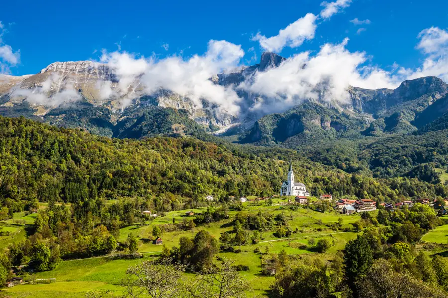 From Drežnica, follow a historic military path across alpine meadows. The trail passes old wartime chapels and scattered stone markers, giving a sense of the area’s layered history. Gradually descend through forests and along hillside paths, to approach the Soča River again. The final stretch leads to Tolmin, where the rivers open into a wide, serene valley, framed by dramatic cliffs and the surrounding mountains.