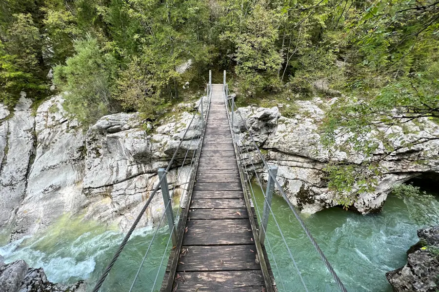 In the morning, your hike follows the Soča Trail, with the emerald-green river flowing beside you. The path winds through forests and open meadows, crossing the Kršovec Gorge via a suspension bridge. Approaching Bovec, the trail passes the confluence of the Soča and Koritnica rivers. You enter Bovec, a lively town surrounded by rugged peaks.