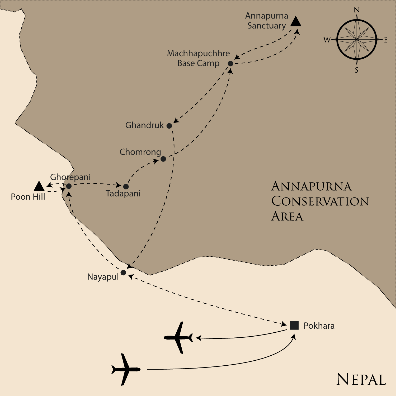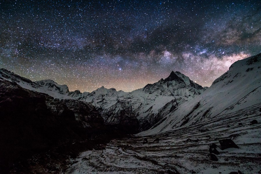 Passing through delightful villages with neatly terraced rice fields to forests of rhododendron and oak, awe-inspiring mountain panoramas unfold each day with the rising sun, and after sunset the night skies glow. Heading further up the Modi Khola into bamboo woodlands, you emerge through a previously secret portal to enter an amazing throne room of mountain gods, the Annapurna Sanctuary. Here at the base of snowcovered behemoths, the mountains of the Annapurna are revealed in close up detail and clarity.