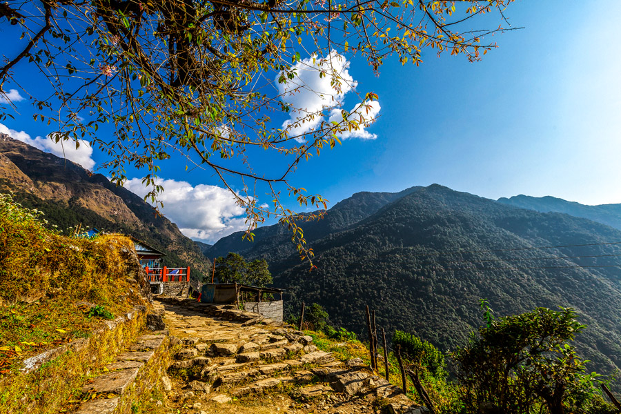 Trek along an undulating trail over small hills to ascend another stepped trail, passing teahouses and small tribal homes. Enjoy glimpses of the Annapurna South and move higher into a wooded area with large bamboo trees before emerging at Nangathanti. Climb more steps and then reach Ghorepani.