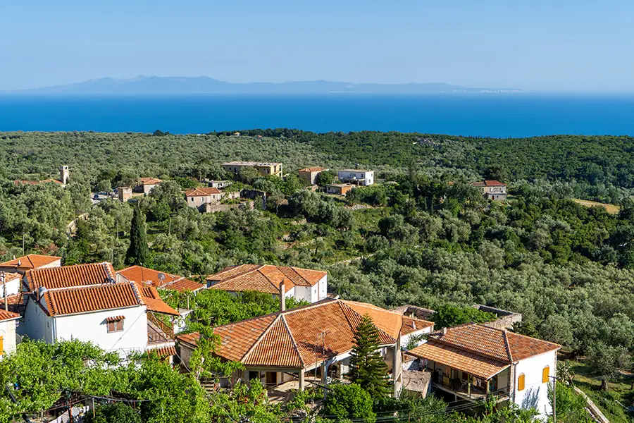 Starting with a brief climb to a viewpoint close to Lukova, views of the countryside and the Ionian Sea extending to Corfu come in to view followed by the trek to Lavani Peak. The path then descends after traversing olive groves, leading to the final drop into Piqeras.
