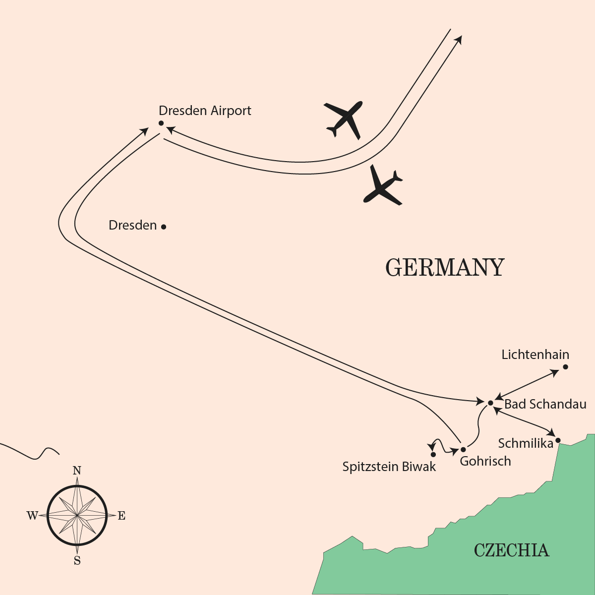 Depending on your flight schedule, you may have time to visit Rathen and enjoy a final walk to the famous Bastei Bridge, dramatically perched among sandstone pinnacles above the Elbe River. The route continues via Rathewalde, before descending back to Rathen.
