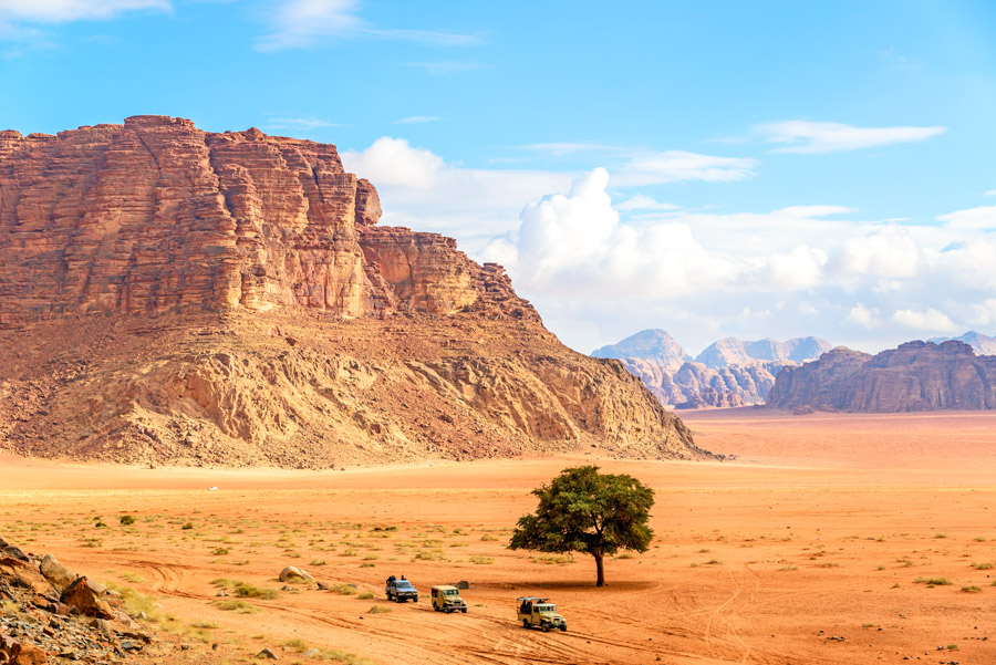 You'll be taken by jeep to the foot of Um Ad Dami Mountain, the highest peak in Jordan (sitting at 1,854m). Later this afternoon you'll have a two-hour jeep tour climbing sand dunes and rock bridges, exploring the Wadi Rum’s valleys, canyons and deserts.