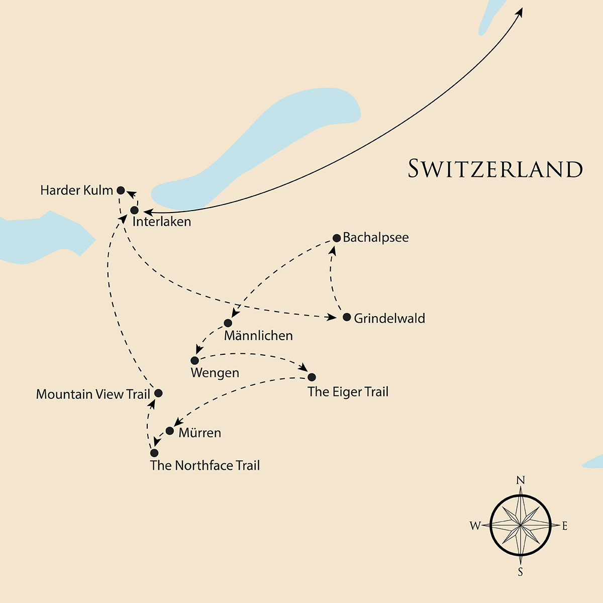 Today you walk to the top of Interlaken, Harder Kulm, with spectacular views of the Bernese Oberland massif. Some of the sights you can see include Lake Thun, Lake Brienz, and panoramas of the Eiger, Mönch and Jungfrau peaks. For those with a head for heights, the walk to the overhanging Zwei-Seen-Steg (Two Lakes Bridge) is a must.