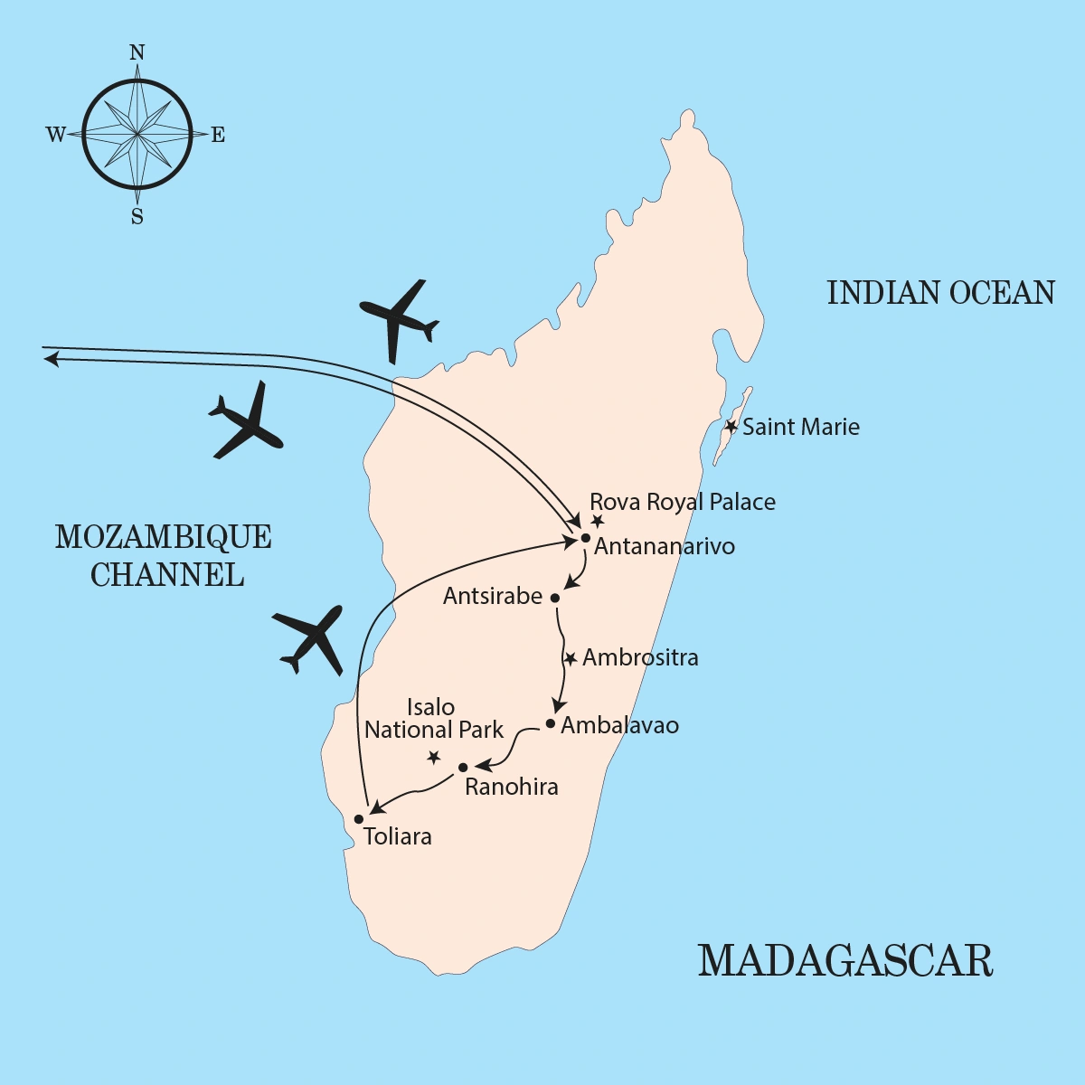 Optional Extension: After the main tour, extend your stay on the tropical island of Sainte Marie, relaxing in a half-board beach resort with palm-lined shores and turquoise waters.