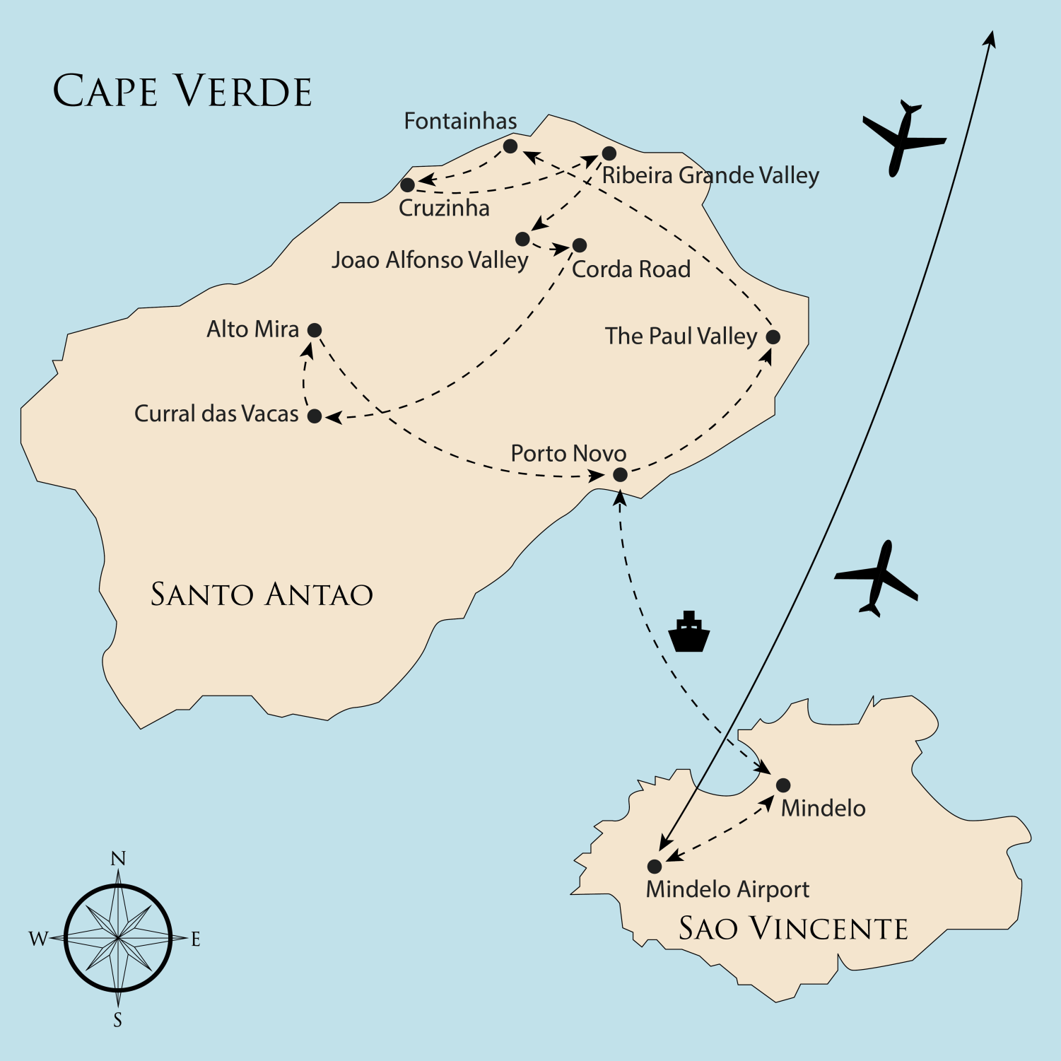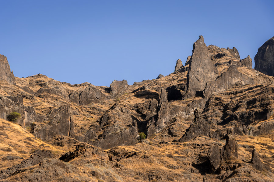 This morning you climb towards a series of ridges overlooked by basalt needles, onto a trail that snakes between fertile plantations and bare lava walls several metres high. On the descent into Ribeira Alta Valley, the terraces with sugar cane and bananas contrast with the barren rockscapes higher up. After the hike, you transfer to Porto Novo Harbour and take the ferry back to Mindelo on São Vicente Island.