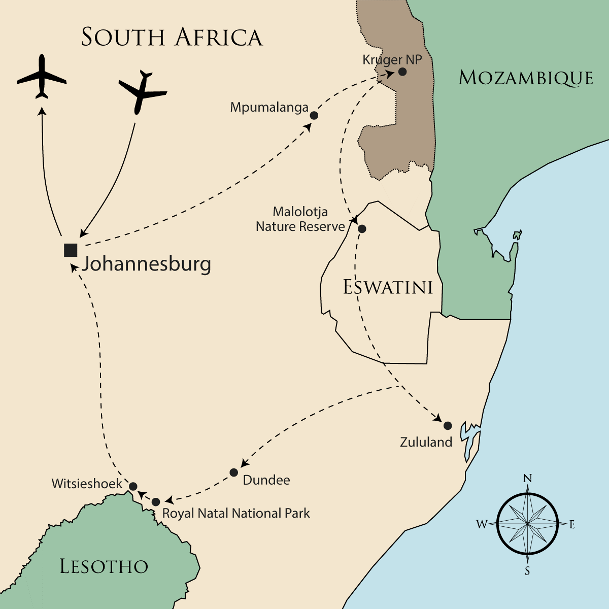 A truly unique walking holiday where you will explore a variety of scenic, cultural and wildlife destinations in South Africa. View the big game of Kruger National Park, experience the country's natural and cultural heritage, explore the hills and valleys of Zululand and trek in the Drakensberg mountains.