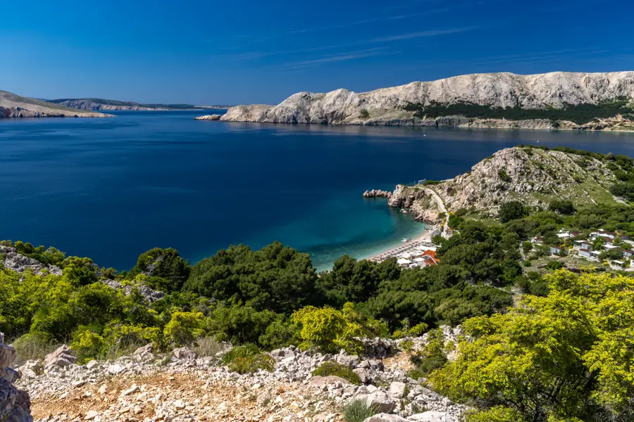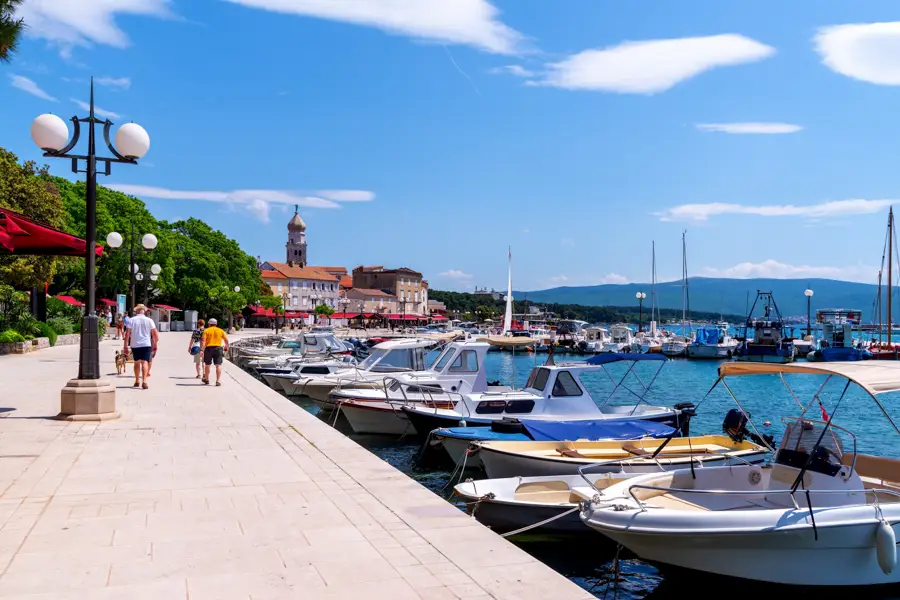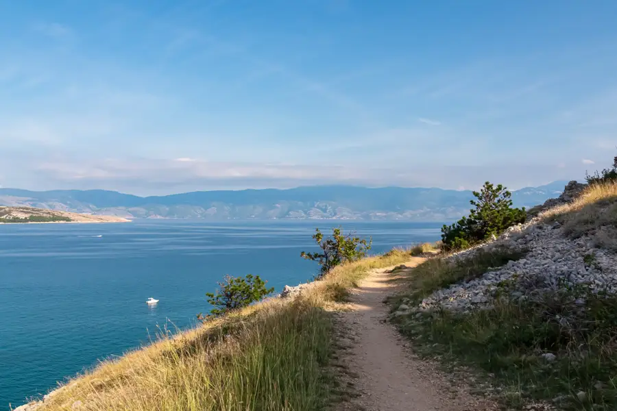 Transfer to Krk Island. Hike scenic seaside and inland routes, with opportunities for swimming.