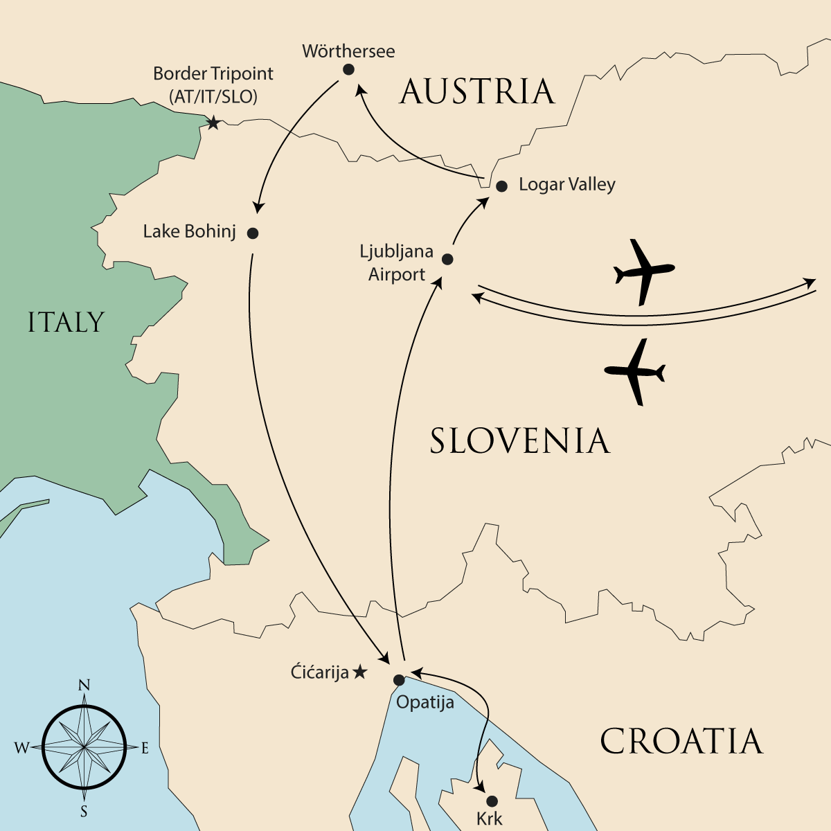 Explore three countries on foot - Slovenia, Austria, and Croatia - through alpine valleys, historic peaks, and coastal paths. A walking journey of changing scenery, rich cultures, and natural beauty.