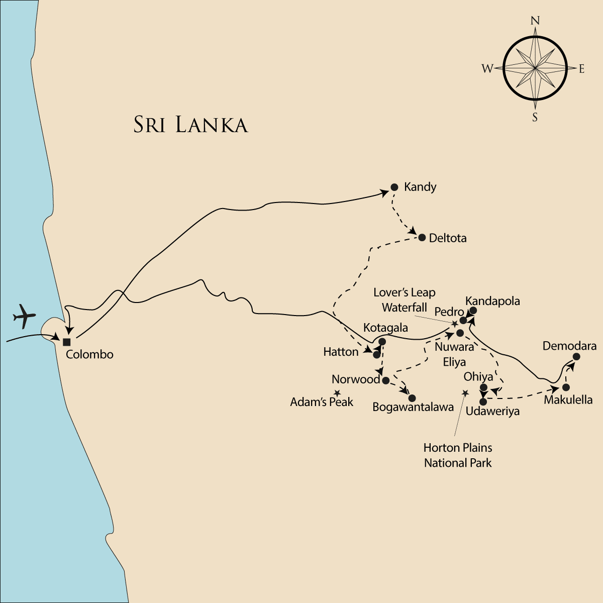 Today’s trek takes you through tea country, with scenic views of Castlereagh Lake, Adam’s Peak, and lush valleys before reaching Bogawanthalawa.