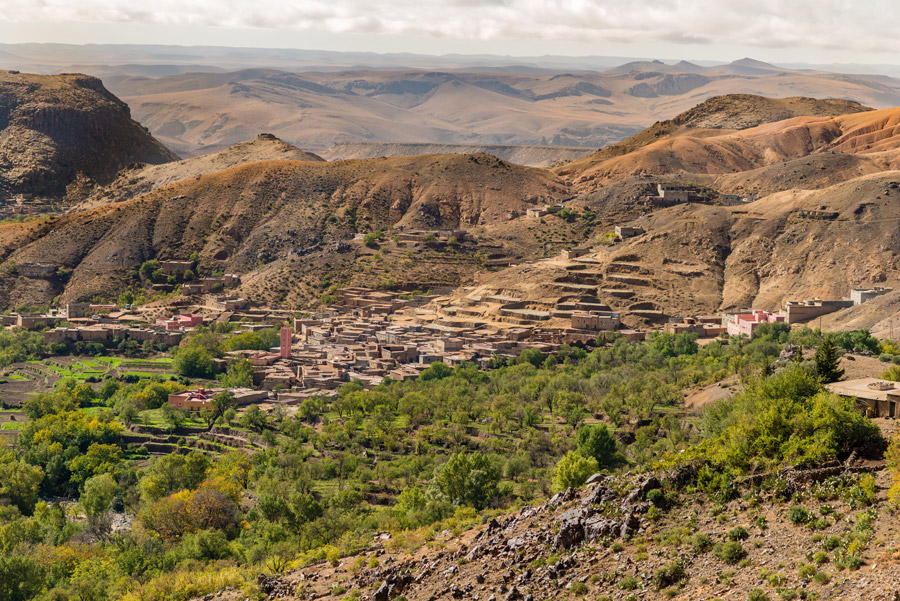 Transfer via Tizi n’Tichka to Taddert and trek along the dirt road to the village of Izihks where you'll stop for lunch. Following local trails, there's around 400 metres of steady ascent to a small col, before descending into an idyllic valley below which contains a smattering of tiny Berber villages. Continue to Titoula village.