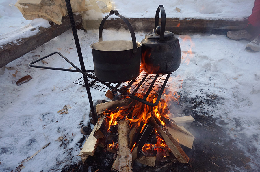 We embark on a journey to the first of our charming wilderness cabins. Our snowshoe trek begins with a scenic walk along a ridge between two stunning frozen lakes, then meanders through enchanting snow-covered forests. By afternoon, we arrive at the idyllic wilderness cabins, perfectly situated near the peaceful waters of the Iikoski River.