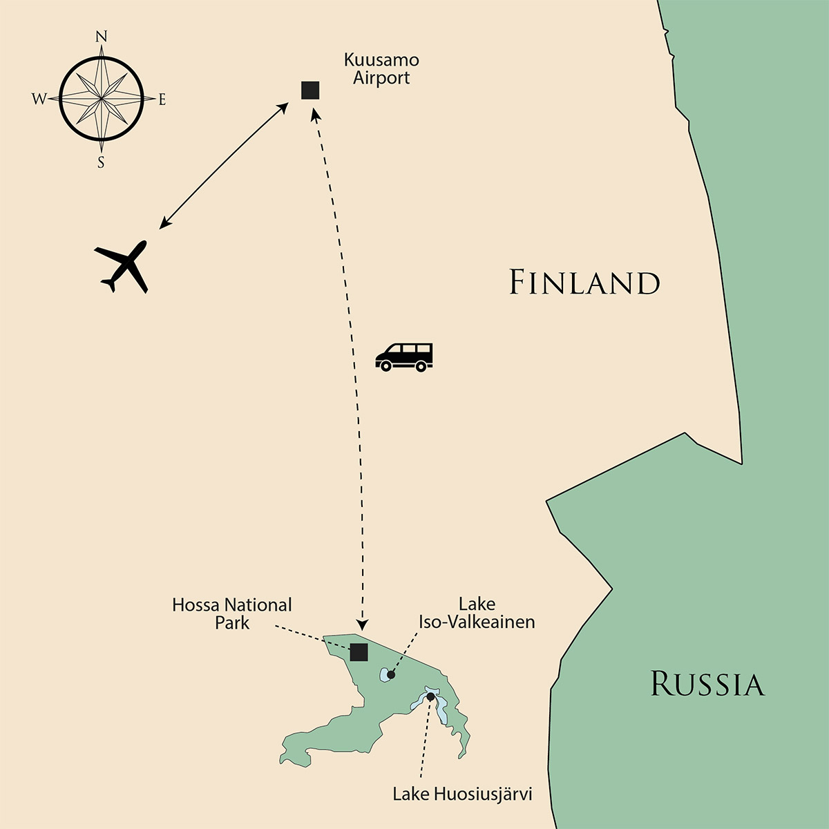 Upon arrival at Kuusamo airport, a transfer of roughly one hour takes the group to our accommodation near Lake Jatkonjärvi.