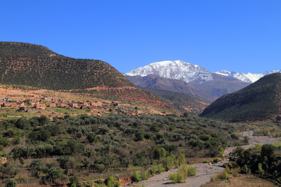 Descend down valley on a piste track, passing tiny villages along the way to Tinerhourhine. You'll then ascend up a zig-zagging mule trail to reach the Tizi n'Tamatert where there are stunning views. Descend and take a detour through the village of Targa Imoula to follow a villagers' trail up to Aremd, where mighty Toubkal dominates the skyline.