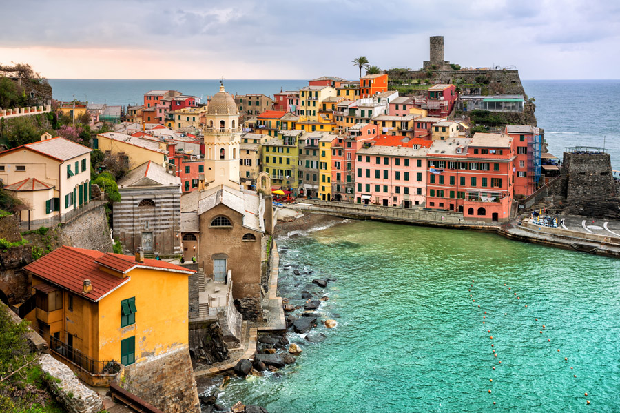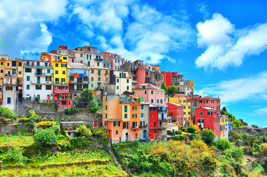 A little corner of paradise, the Cinque Terre - meaning five little villages - is located in the Liguria region at the end of the Riviera di Levante. Generations of farmers shaped the mountains by building stone walls to retain the land and create cultivation terraces. This area is steeped in tradition and has a strong local economy. Nestled above cliffs or deep coves, the colourful houses of these little villages line the seafront and help create this areas unique landscape.