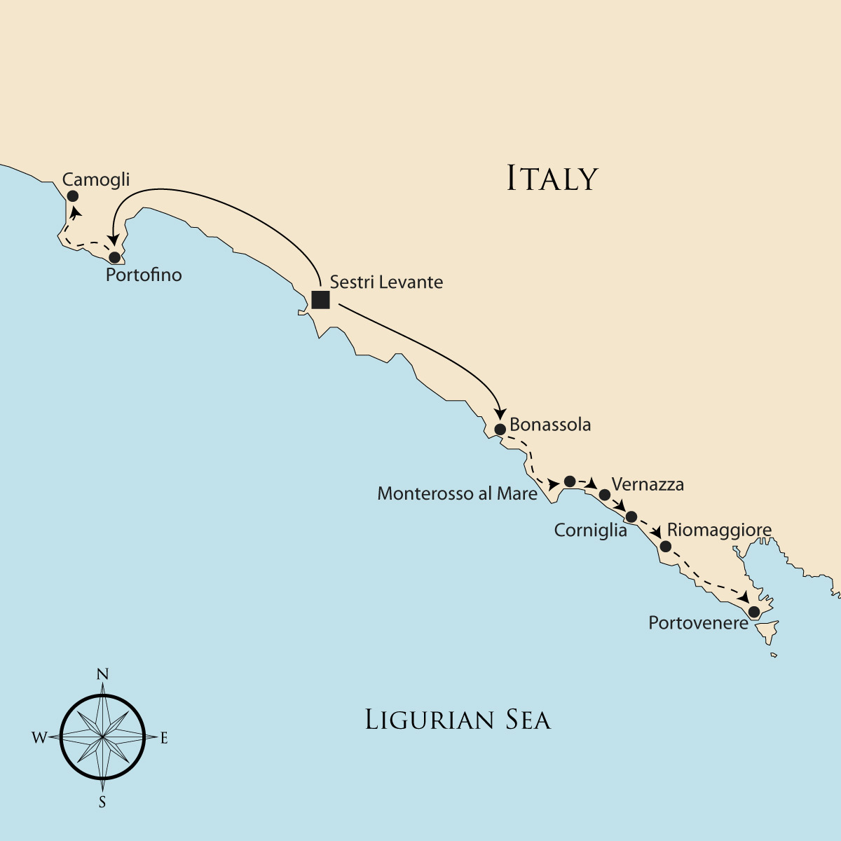 Day 1: Fly to Genoa & transfer by train to Sestri Levante